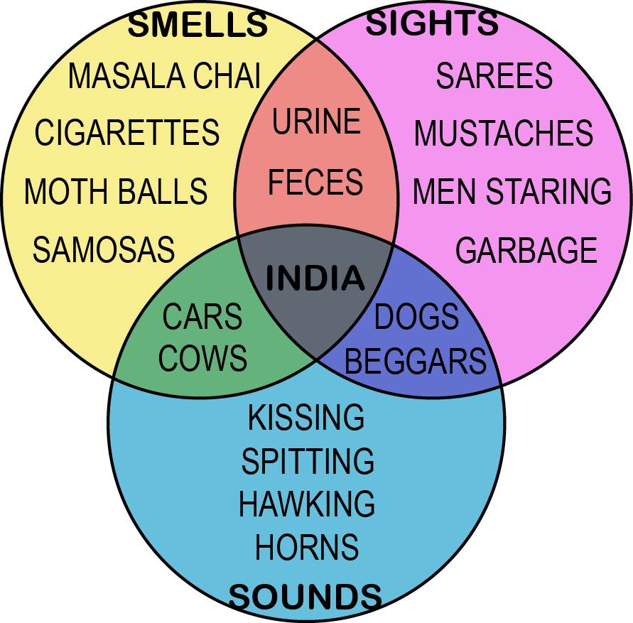 This Venn diagram is an abridged breakdown of what we’ve encountered in north India (the south is still to come, and supposedly a different world). It is a visual representation of how the sights, smells and sounds of this country overlap. When you read it, close your eyes and imagine these things surrounding you. Smell the odors, hear the cacophony of noises and try to visualize the things I’ve seen. The key to understanding India is knowing that using one of your senses, even when your eyes are closed, is impossible.