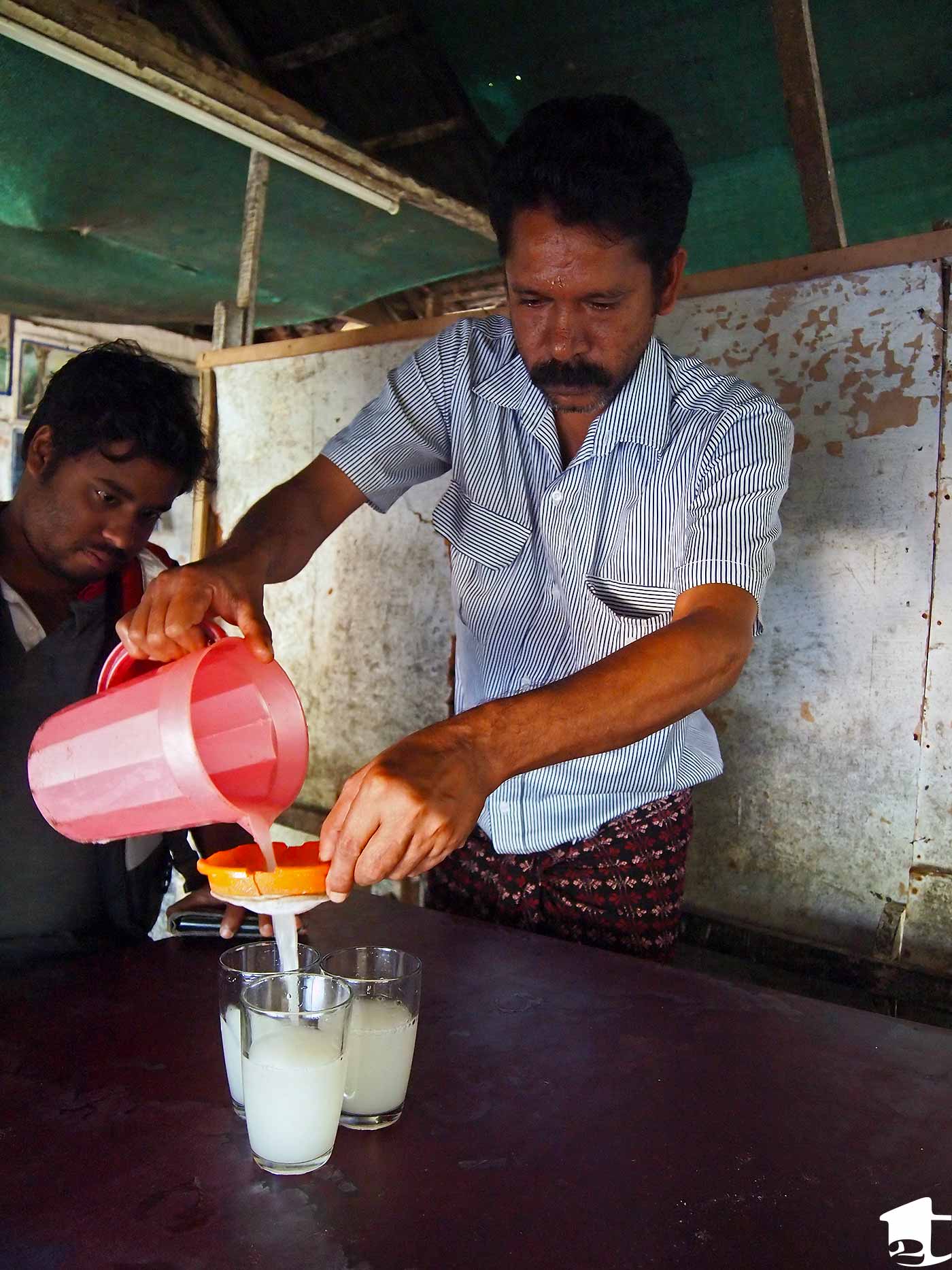 Toddy is a delicate liquid. It is extracted from palm trees each morning (each tree can deliver approximately 5 liters per day!) and ferments so quickly that it must be drank that day. So the later in the day you go, the higher the alcohol content. The good thing is that you’re always guaranteed fresh toddy in the villages. Binu warned that the “palm toddy” sold in the main town is neither tasty nor authentic, as it is usually an artificially made mixture intended to get one drunk.