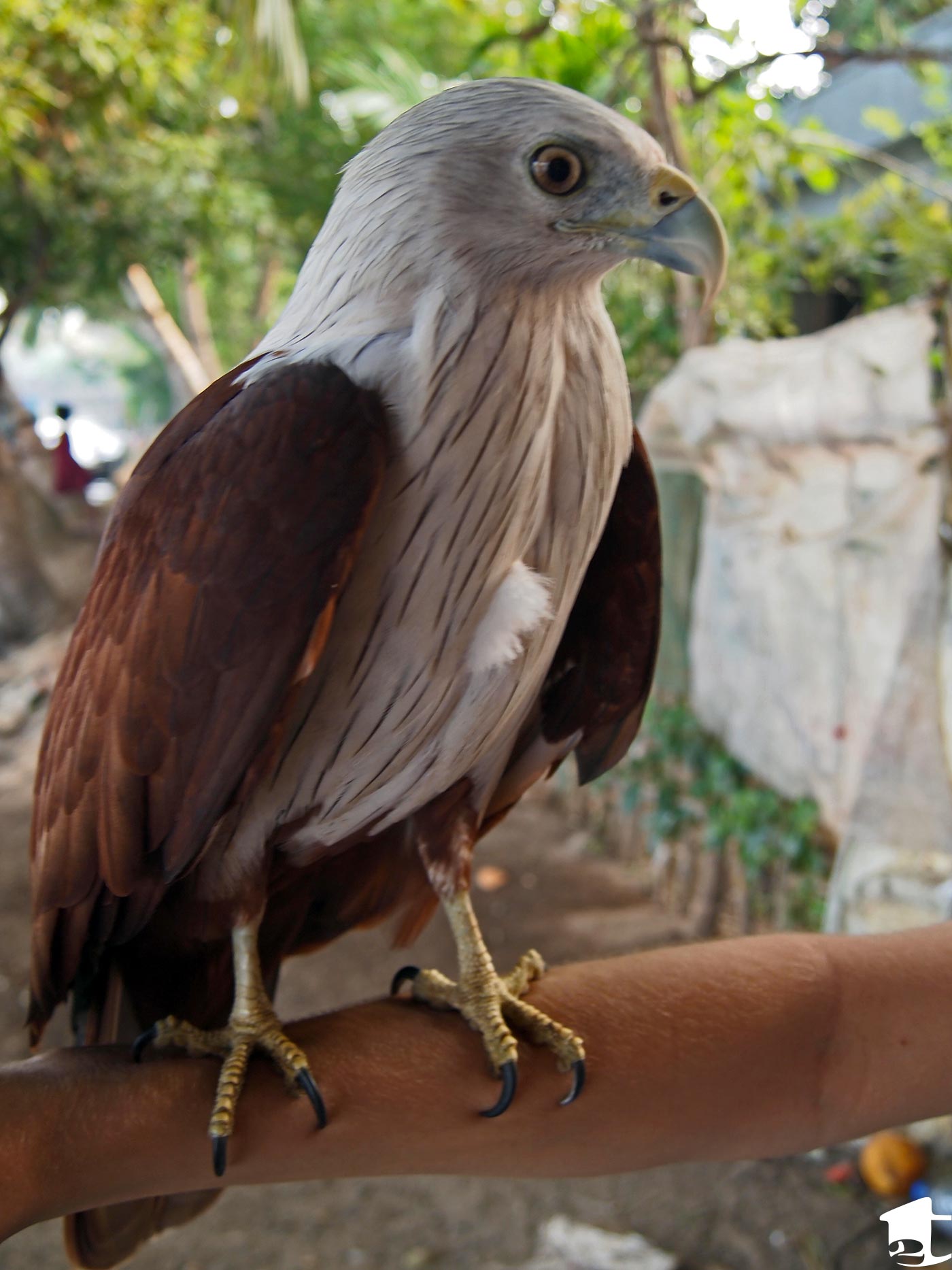 As we were waiting for our meal, we spotted two fish eagles hanging out in the rafters above us. Binu smiled and asked if we wanted a closer look. Turns out they hang around the restaurant as “pets.” (The locals feed them the occasional fish and the eagles come and go as they please.) One of the locals called to the eagle like a domesticated bird and extended his arm for the fish eagle to hop up. He then placed the eagle on our arms and shoulders so we could get a closer look and take photos. It was awesome, and what a beautiful bird!