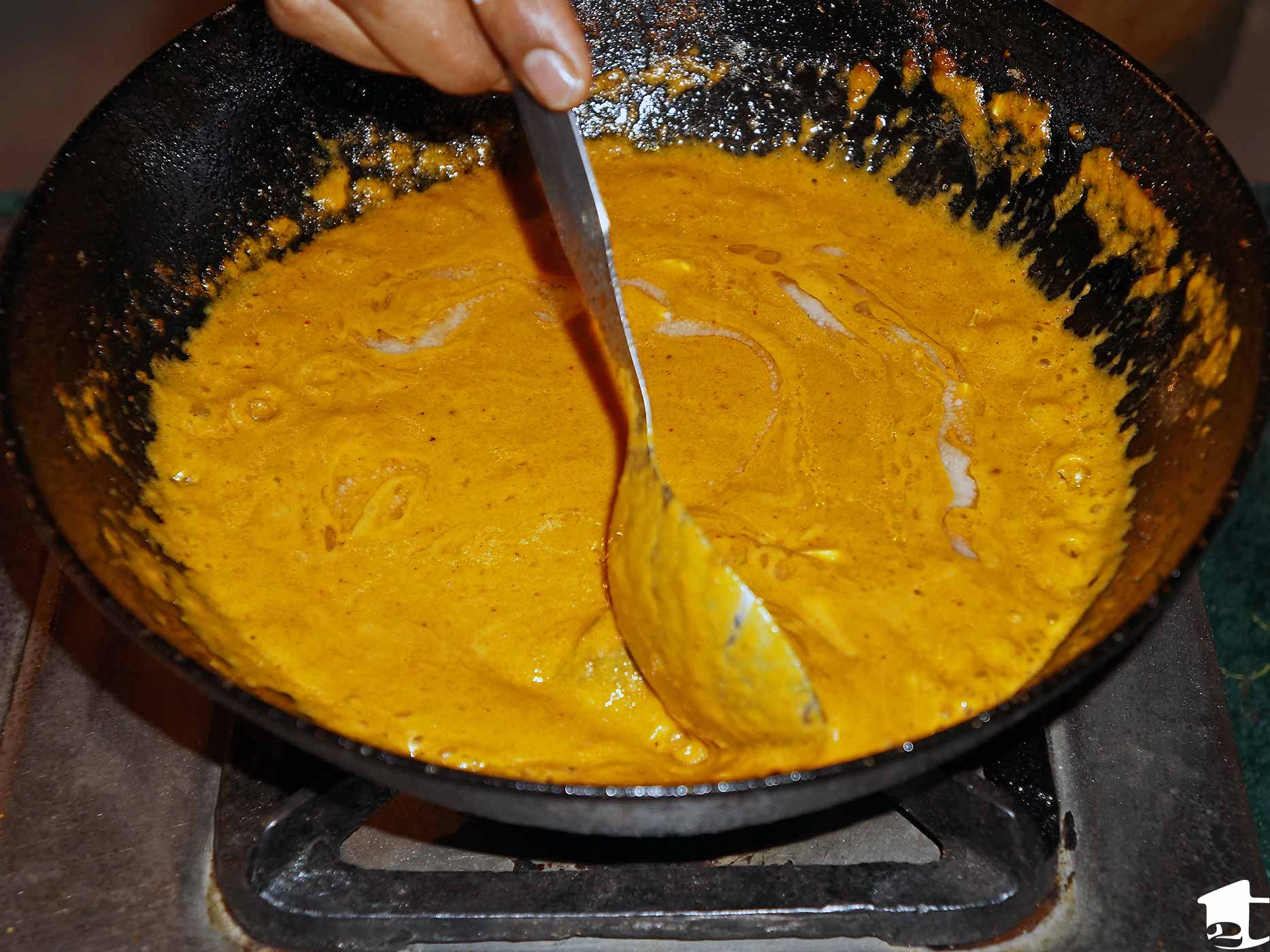 Step 2: Pour 2 tbsp oil into a pan with the heat on medium. Fry the bay leaf and cardamom for 30 seconds. Then add the pureed masala (masala = mixture. In this case, we’re referring to the mixture from Step 1.). Saute while mixing frequently to avoid burning. Do this for 5-10 minutes while the sauce thickens. The mixture will be ready when the oil rises to the top of the mixture.