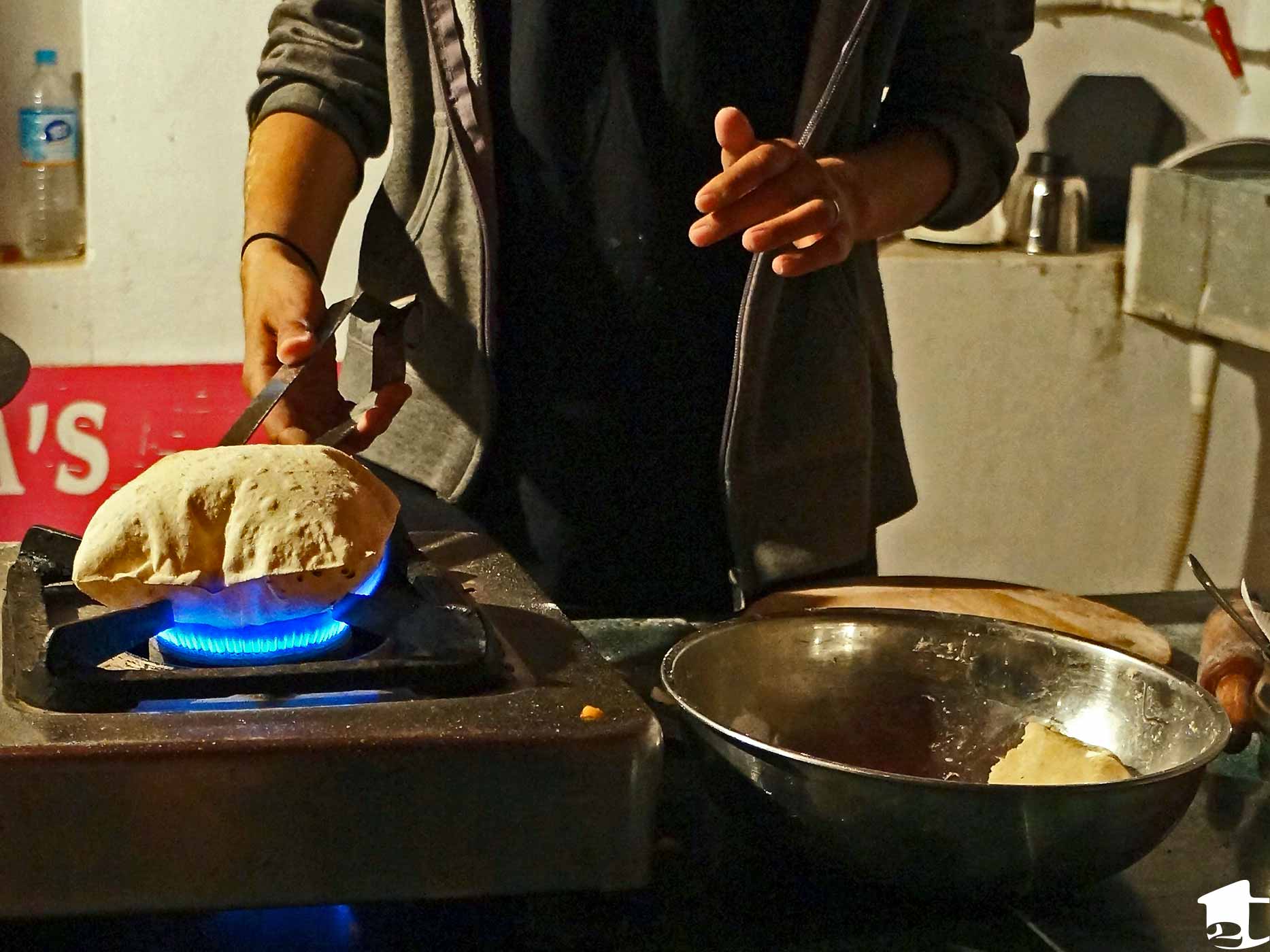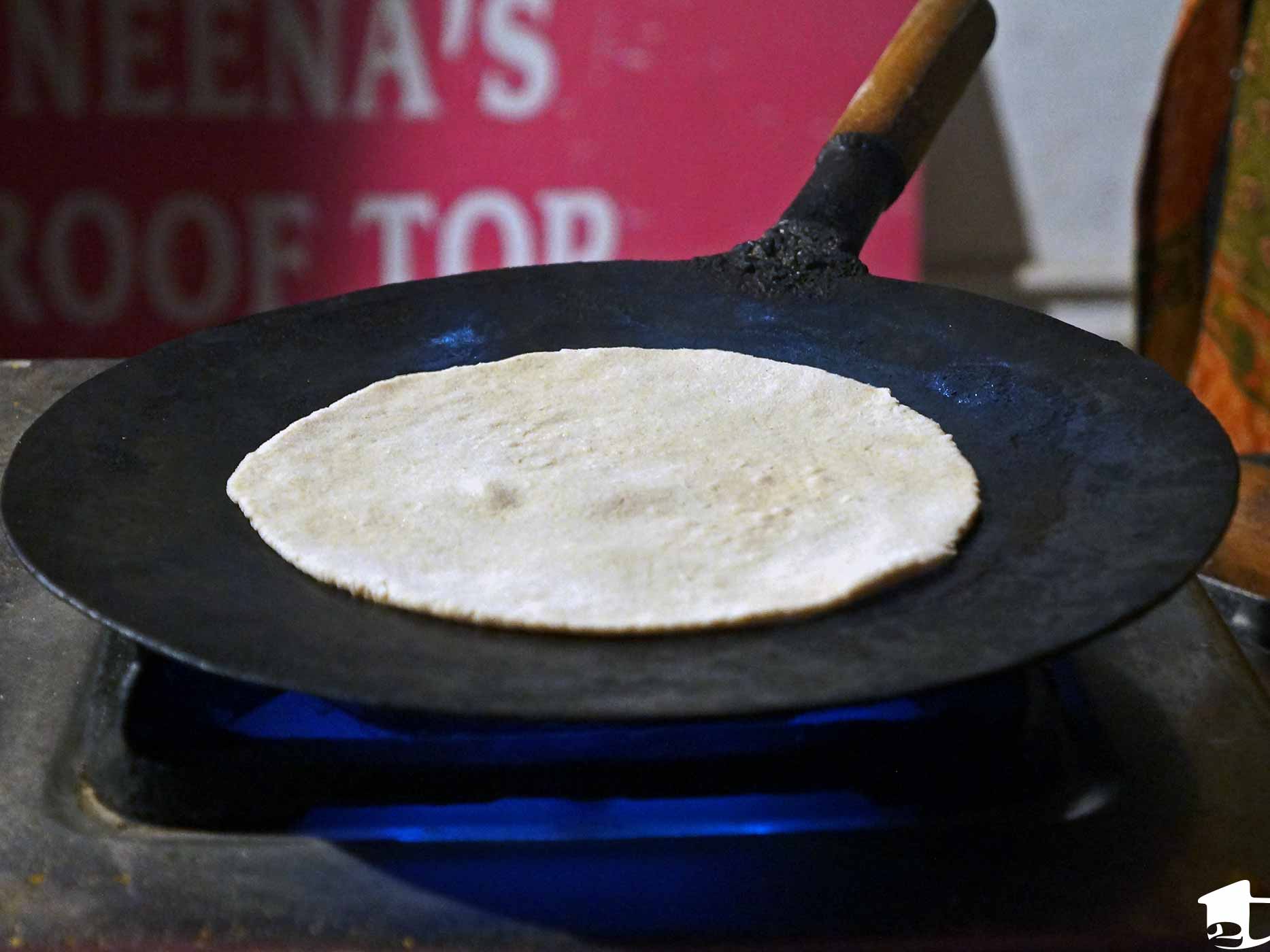 Heat a flat, round pan on the stove. Place the rolled out chapatti dough onto the pan. When the first color change begins, flip the dough. Once color change appears on the other side, flip the dough onto an open flame. The dough should puff up. Flip it once to add color to the opposite side. Then move it from the flame to a plate and flatten the bubbles. If desired, add melted butter to both sides and set aside to cool.