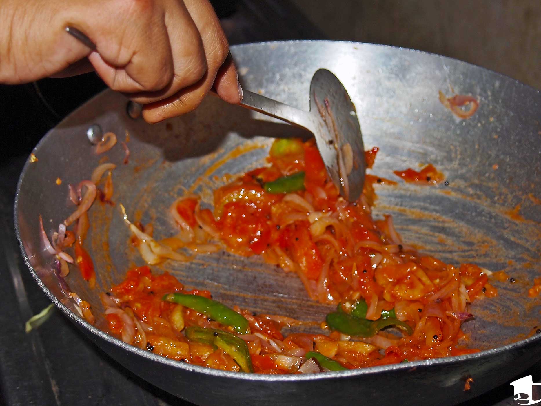 Step 2: Add onions and chilies, stir, and reduce heat to low. When onions start to brown, add tomatoes and salt, stirring occasionally until the tomatoes soften (for the next 5-7 minutes).