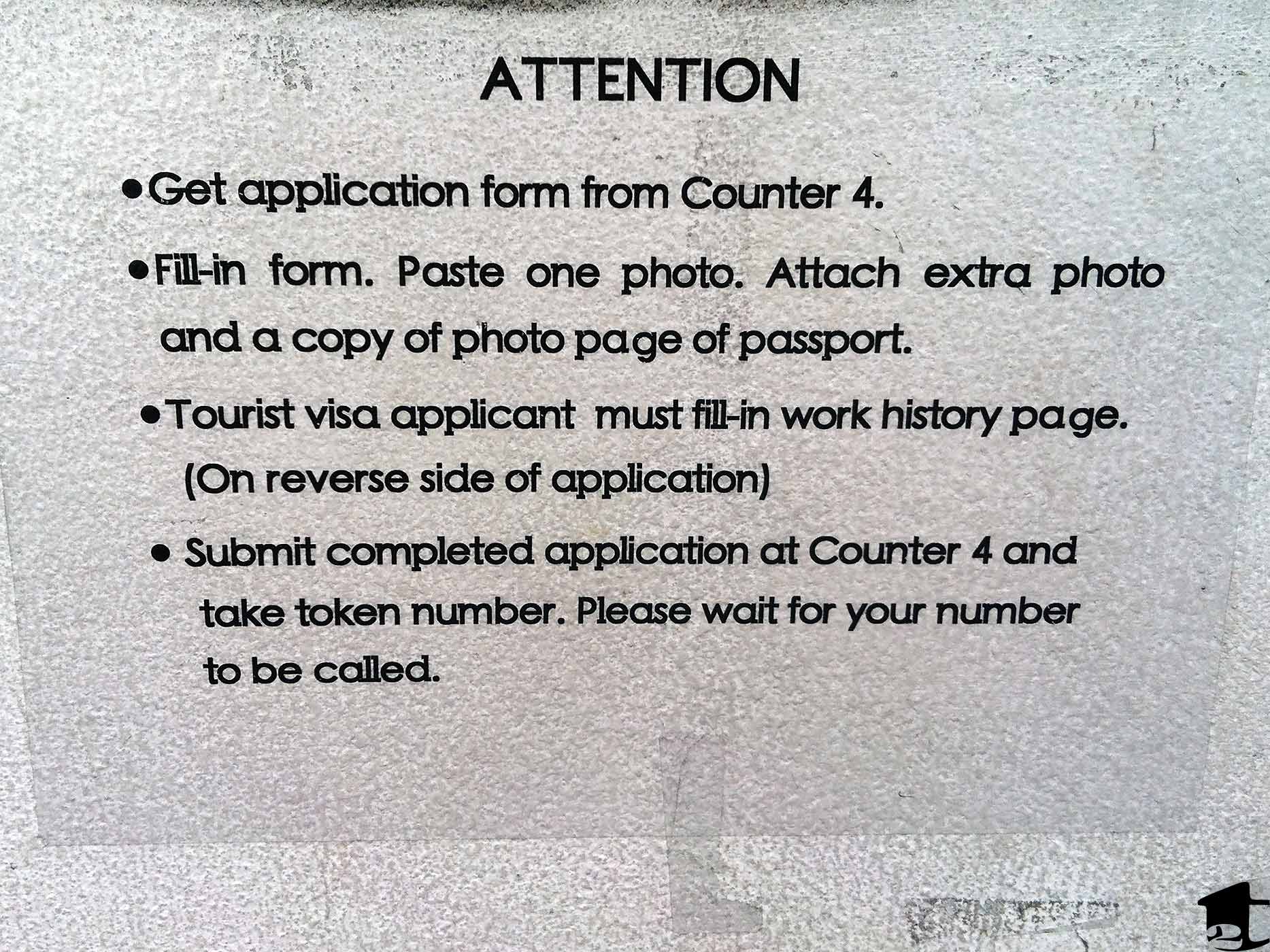 3) Two passport-sized photos: There is a shop that offers photo services just across the street from the embassy’s gate. One photo will be clipped to the application and the other will be glued. The embassy provides scissors, glue and paperclips next to counter 4.