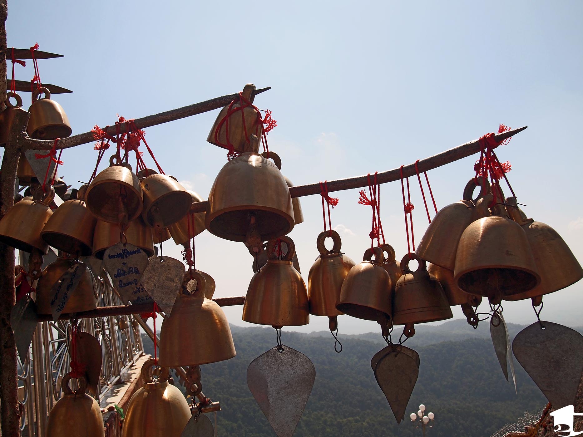 There were signs at the temple’s entrance warning that anyone wearing shorts, short skirts or revealing tops would not be allowed to enter, but I spied a couple tourists violating this rule and they were floating around without any problems. Unfortunately, this ended up being the second location we visited where women are barred from entering certain areas. In the case of the Golden Rock, men are allowed to go directly up to the Rock, to either pray, take pictures of it, apply gold leaf to its surface, etc. However, women are relegated to a walkway next to and underneath it. In addition to affixing squares of gold leaf on the Rock, bells are also for sale — people attach them to surrounding fencing either in memoriam or as a commitment to a current loved one. With the mountain’s constant wind, these bells act as a symphony forever playing in the breeze.
