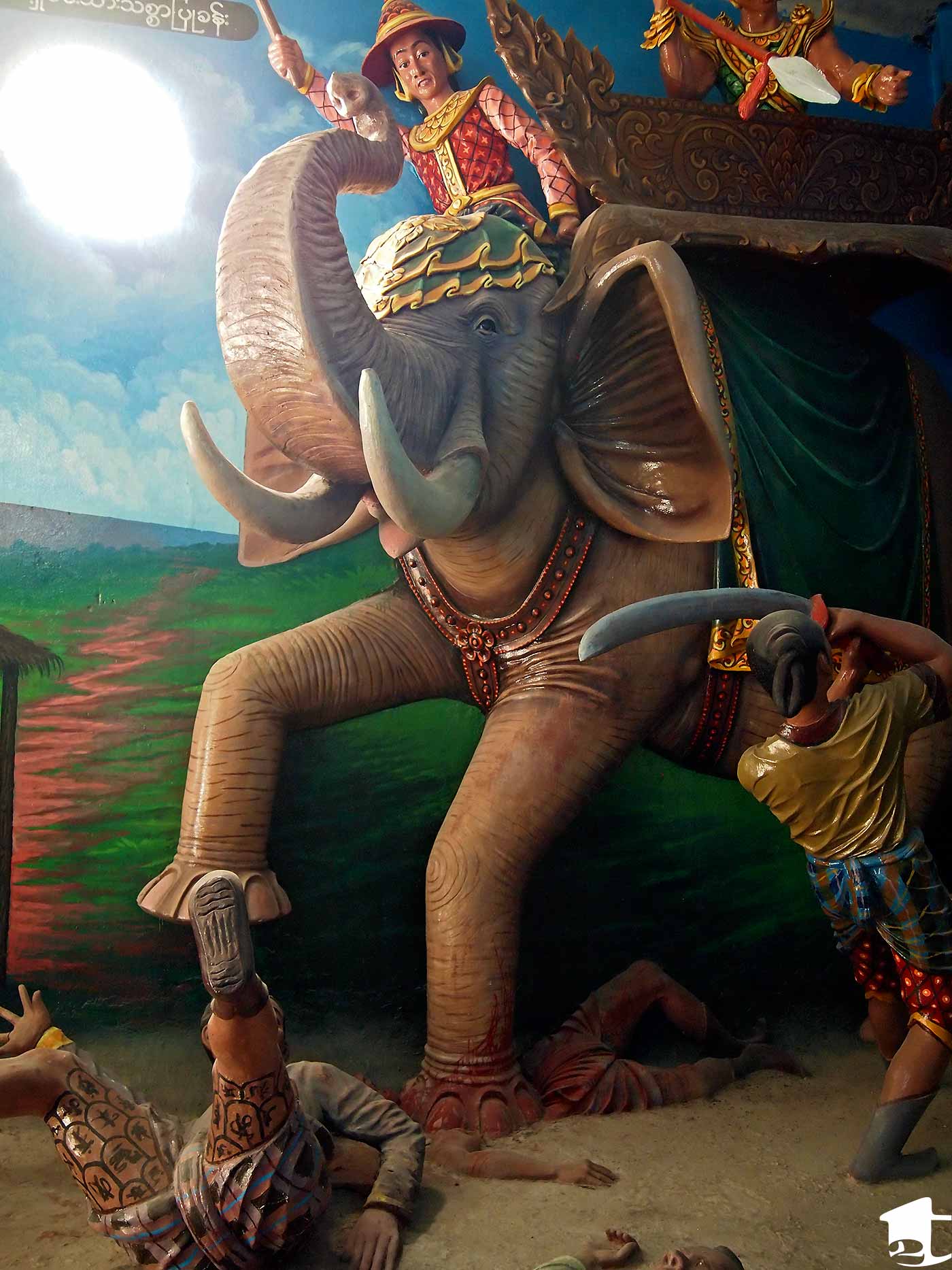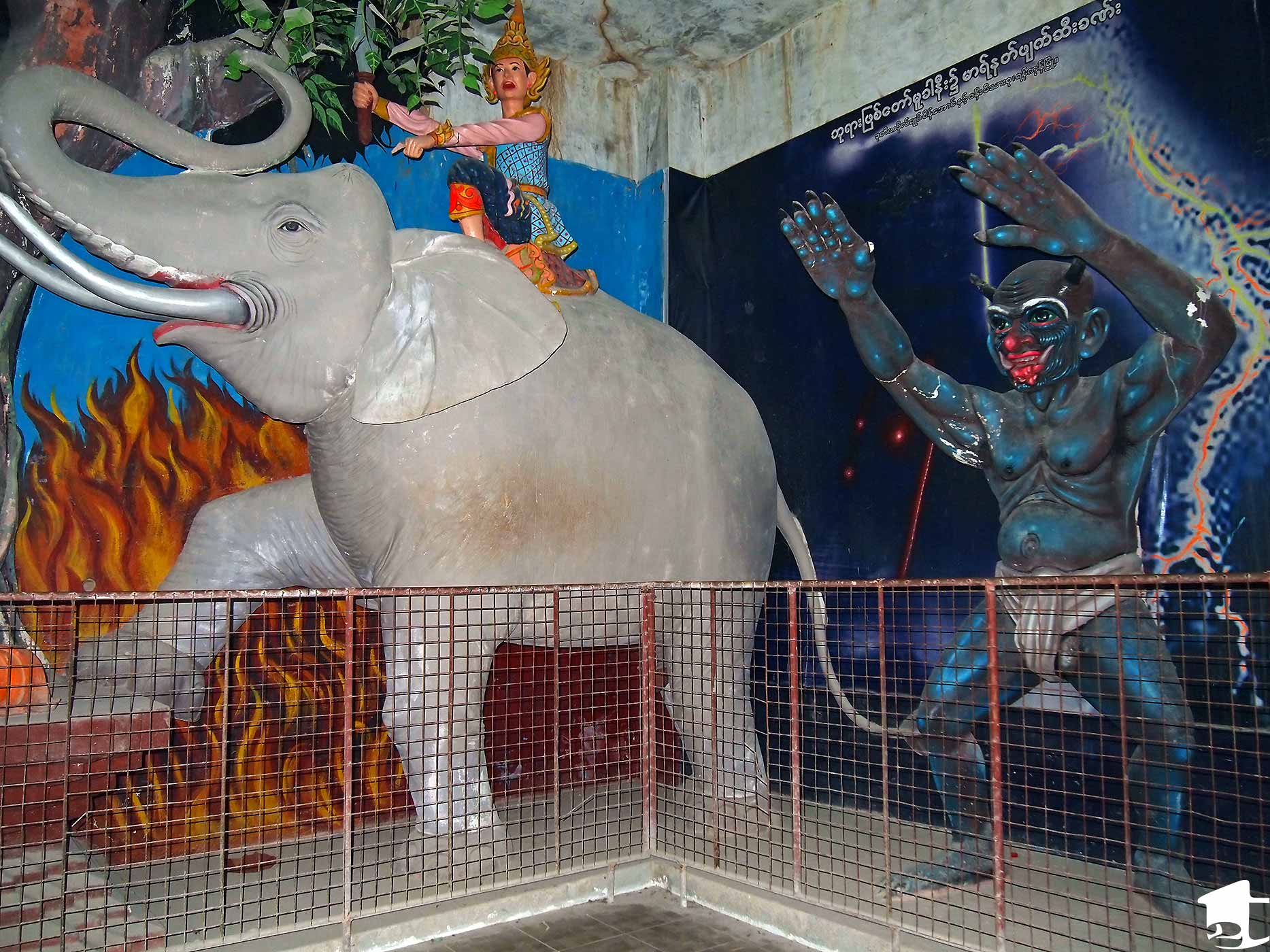 Our fourth stop in Myanmar was the town of Mawlamyine in Mon state. The main reason for visiting this city was to take a day trip to Win Sein Taw Ya, the largest reclining Buddha in the world at nearly 600 feet long. This more than 90-year-old unfinished monstrosity is tucked away at the foot of a mountain range, surrounded by a field of green. Larger-than-life statues of monks and pagodas of varying sizes dot the surrounding landscape. Unbeknownst to us before arriving, you can explore the inside of the Buddha. It contains scores of dioramas of the teachings of Buddha with captions in Burmese. If a Buddhist theme park existed, this would be it.