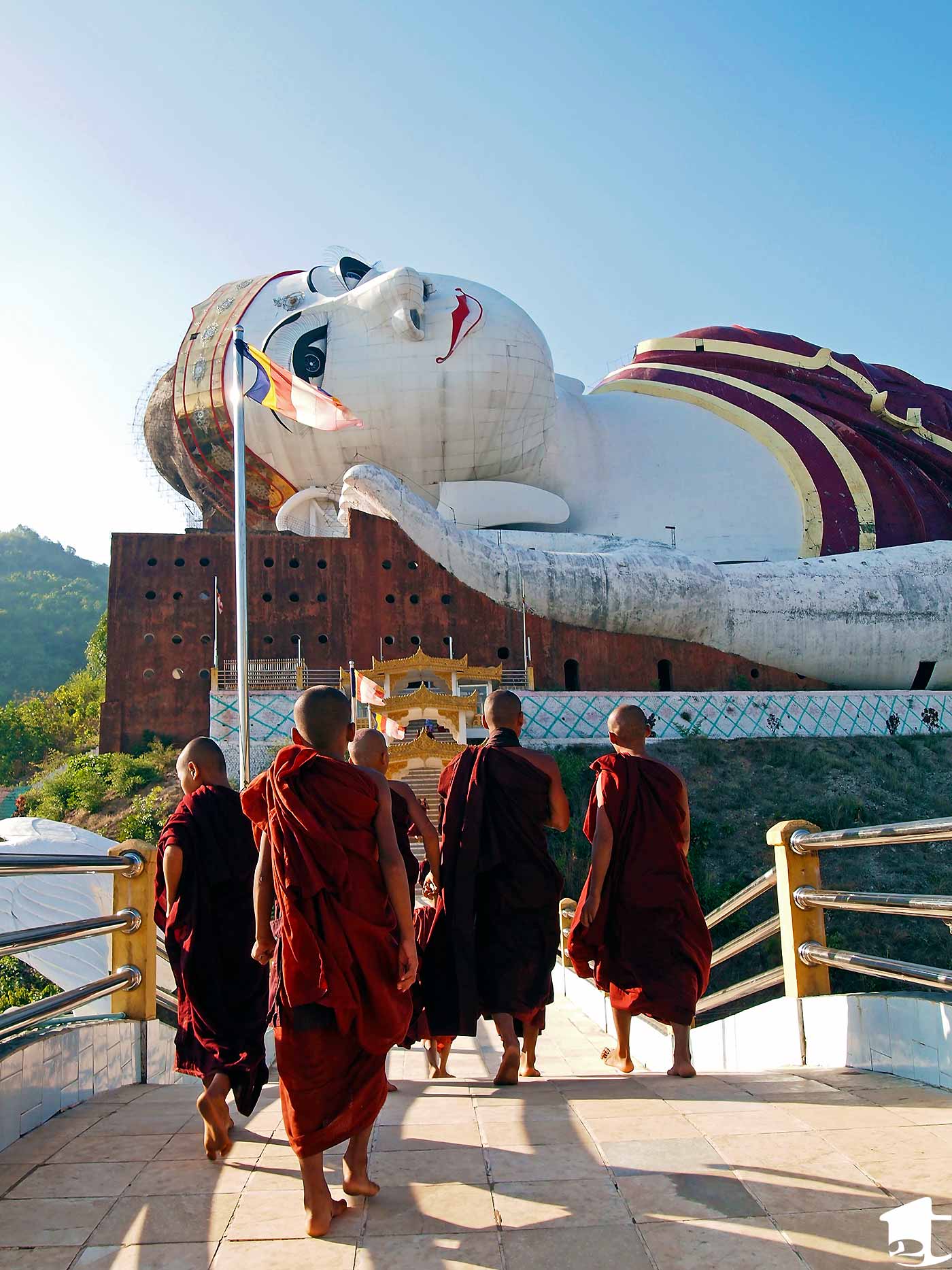 - Can you see the giant monk on the right and the reclining Buddha’s head in the distance on the left?