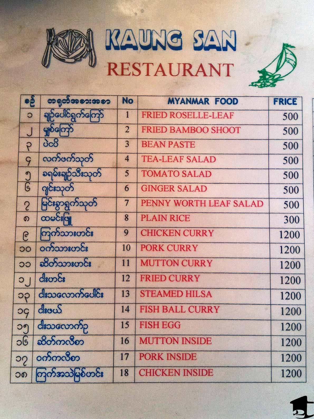 The menu…. of the restaurant in Kin pun, There, you can only read the right side of the menu which say “Myanmar Food” in English. But on the left side. in Burmese words, it say “Chinese Food” but the menu items are Burmese food.