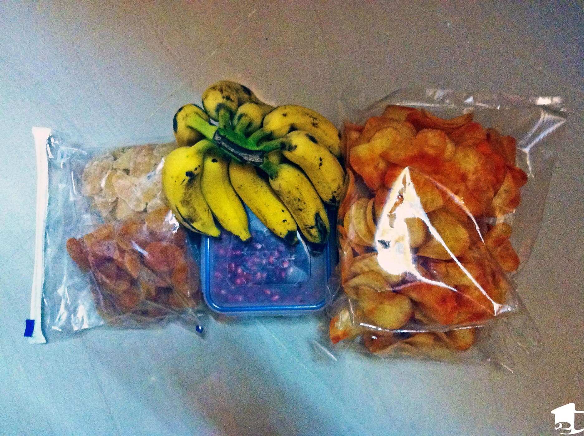 Our travel-day snacks in India: crystallized ginger, dried apricots, bananas, pomegranate seeds, and freshly made tapioca chips.
